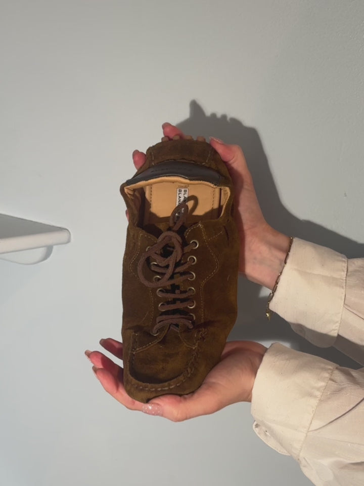 The Nella is a women’s leather Sneakerina made in soft suede with hand-stitched detailing along the toe. The lace-up construction makes the fit highly adjustable, allowing the shoe to adapt easily to different foot shapes and needs throughout the day. It sits on a lightweight, flexible driver sole that follows the natural movement of the foot, offering comfort and stability without stiffness. A padded leather heel tab adds support at the back, while the low, streamlined profile keeps the shoe easy to style — from relaxed tailoring and denim to dresses and travel looks.